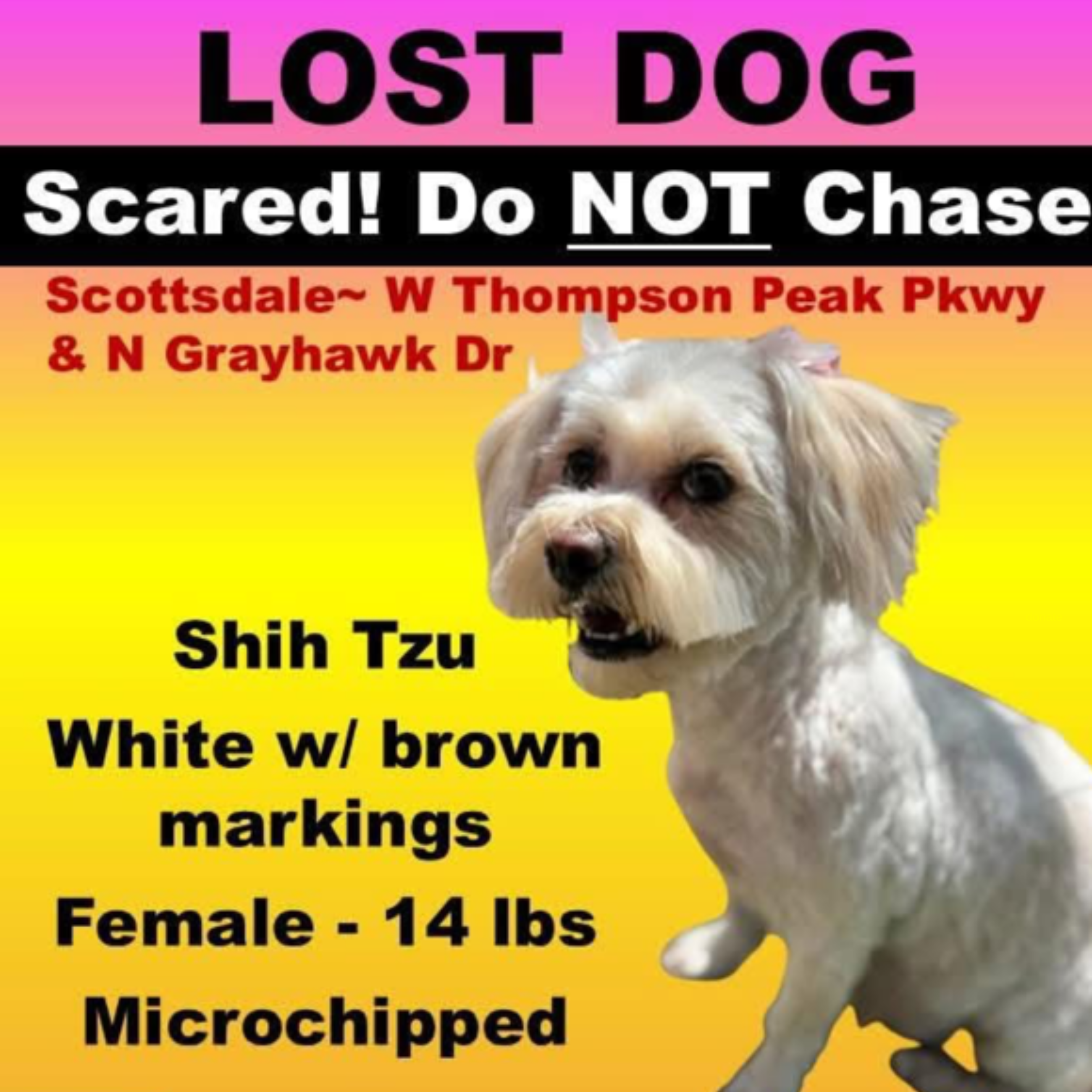 A rescue dog new to the Grayhawk community is missing from home. She was last seen in Crown Point. 14 lb. Female Shih Tzu. White with brown markings. She is microchipped. Please do not chase her. Call Cathy at H.A.R.T.T. at 602-486-6015.